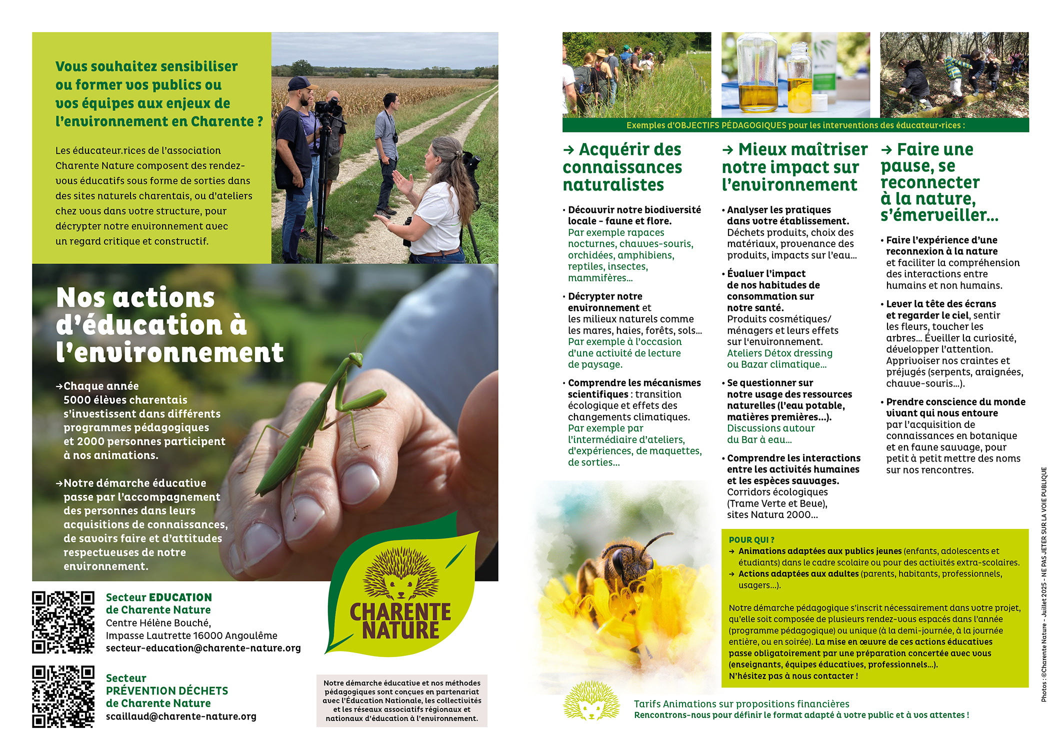 Les éducateur.rices de l’association Charente Nature composent des rendez-vous éducatifs sous forme de sorties dans des sites naturels charentais, ou d’ateliers chez vous dans votre structure, pour décrypter notre environnement avec un regard critique et constructif.