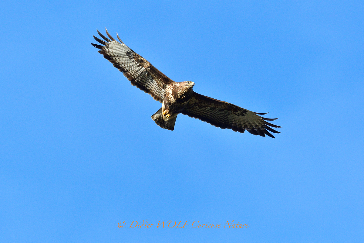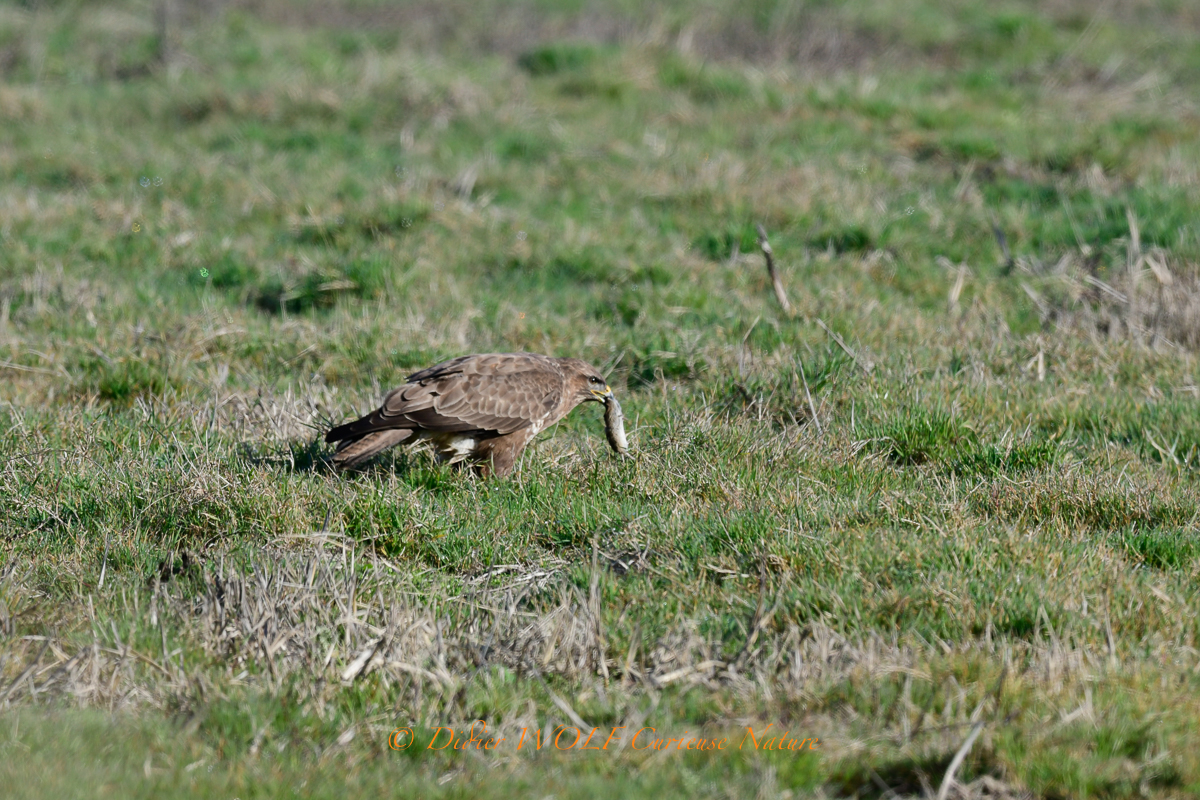 La Buse variable est un rapace diurne assez commun en France. La Buse variable est l’un de nos rares oiseaux dont le plumage peut varier considérablement d’un individu à l’autre, pouvant être d’un brun très foncé ou presque blanche, avec tous les intermédiaires possibles, d’où son qualificatif. Elle se nourrit principalement de micromammifères, mulots et campagnols qu’elle chasse postée à l’affût sur un piquet de clôture. Dotée d’une vue très perçante et d’une très bonne ouïe, elle guette les rongeurs et les taupes qui constituent l’essentiel de sa nourriture mais elle consomme également dans une moindre mesure des mammifères plus gros tels que de jeunes lapins et lièvres, des oiseaux, des amphibiens et des insectes (criquets, sauterelles…) ainsi que des charognes, surtout en hiver quand la nourriture vient à manquer. Les vers de terre peuvent aussi constituer une part importante de son alimentation et il n’est pas rare de la voir marcher dans les pâtures à leur recherche. Oiseau sédentaire et fidèle à son territoire dans notre région, la Buse variable voit ses effectifs renforcés par des migrateurs venus de Scandinavie de septembre à février. Les oiseaux qui nichent chez nous commencent à parader dès le mois de février mais la ponte n’intervient pas avant avril. Les jeunes quittent normalement le nid en juillet. Source : LPO