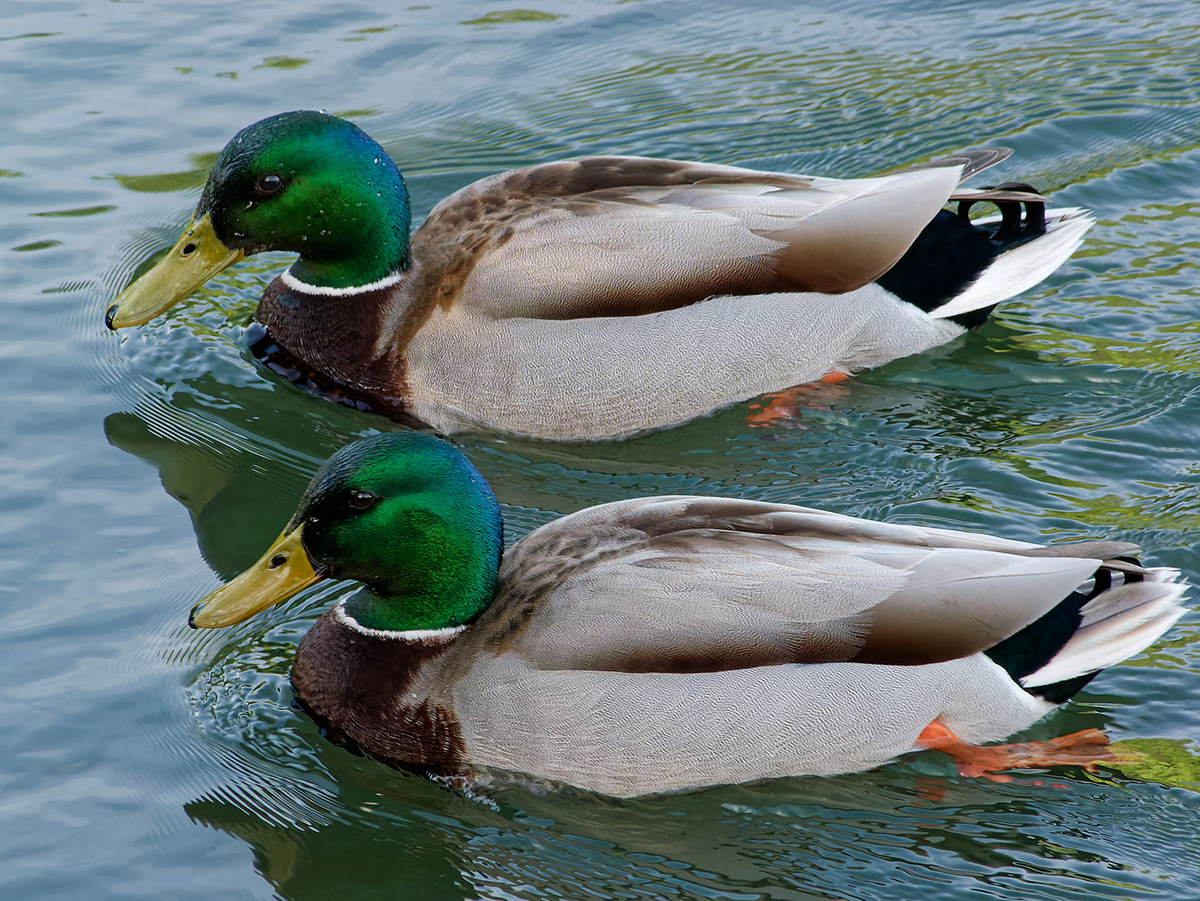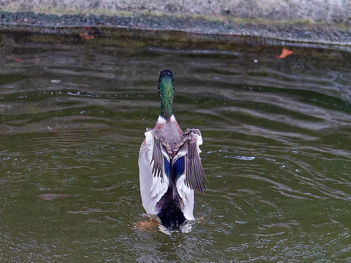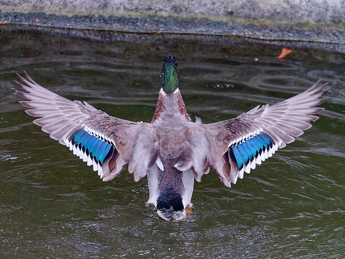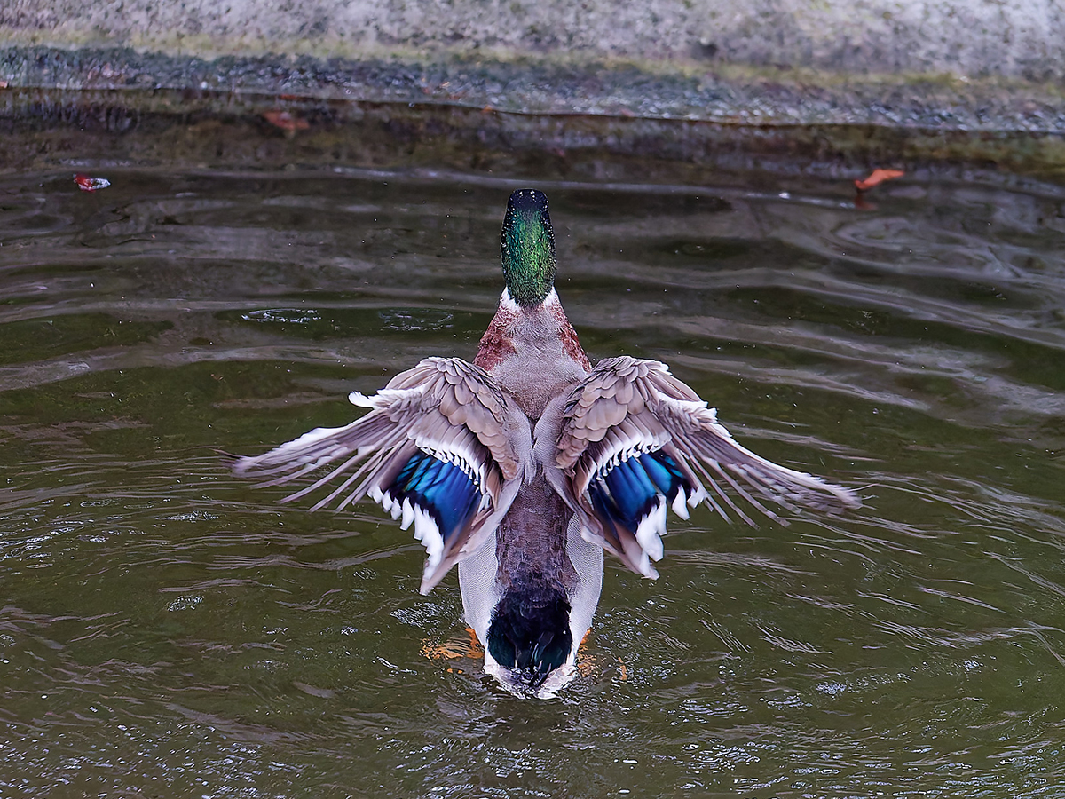 Ce canard dit de surface, « barboteur » confirmé (puisqu’il se nourrit en barbotant ou simplement en basculant la tête dans l’eau), appartient à la famille des Anatidae, avec par exemple les cygnes ou les oies… Présent dans nos espaces aquatiques urbains, le Colvert est capable de voler jusqu’à 80 km/h ! Peu farouche, il sait, si nécessaire, s’arracher de la surface de l’eau presque verticalement grâce aux battements de ses ailes. Ici, on peut observer un canard colvert mâle, replier ses ailes en trois étapes… laissant ainsi paraître le miroir alaire de ses ailes, ces barres bleues aux reflets irisés, bordées de teintes claires ou foncées, qui attirent notre regard et facilitent l’identification des individus par les ornithologues.