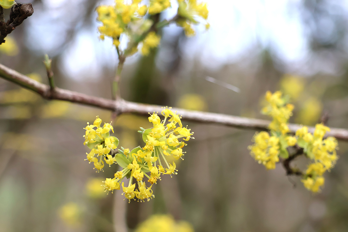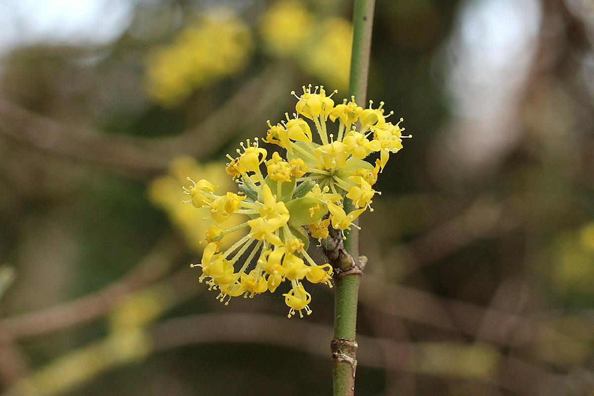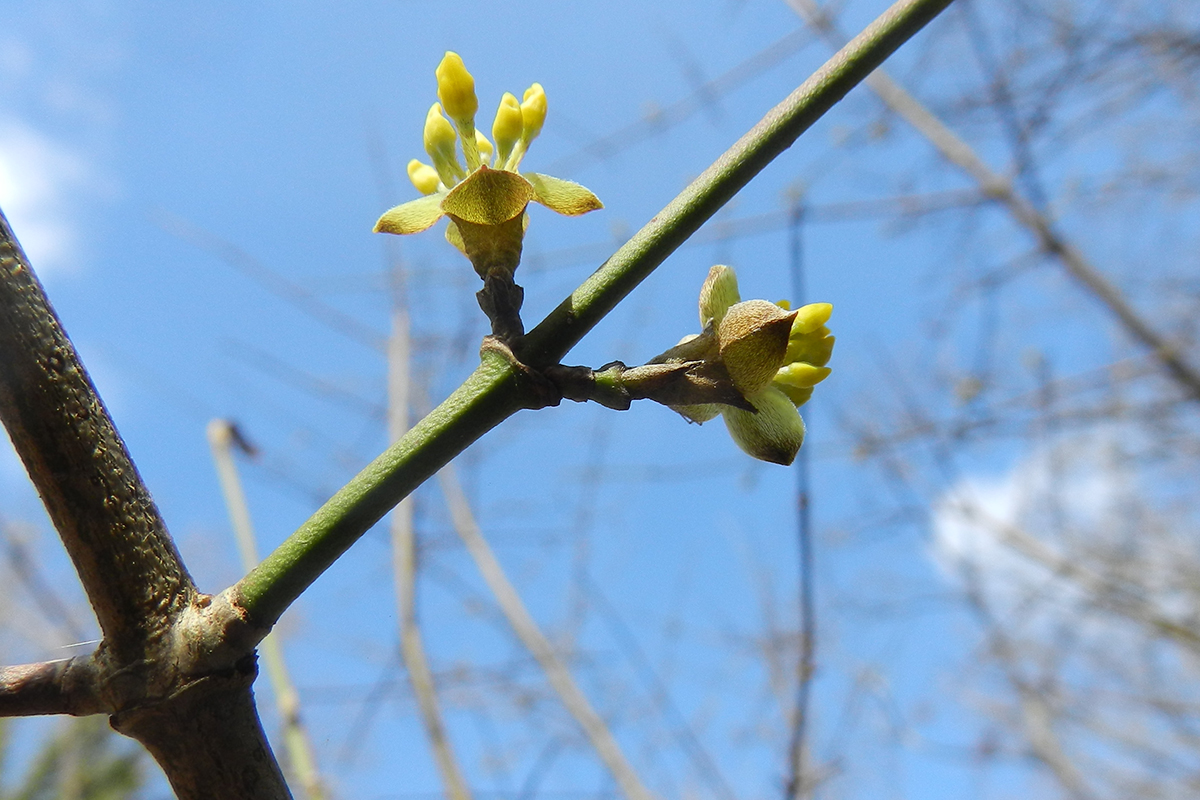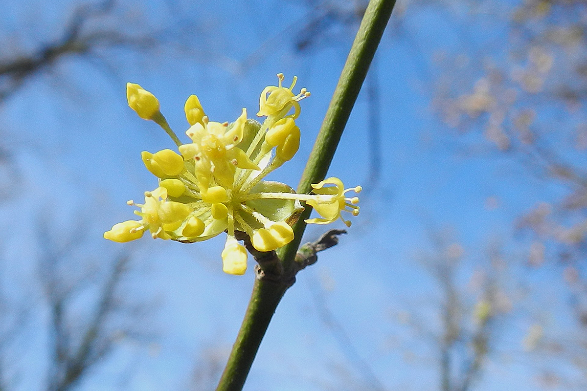De la famille des Cornacées, le Cornouiller mâle appelé aussi Cornier, bois de fer, cornouiller des haies, mimosa du Causse, est un petit arbre ou un arbuste (de 2 à 6 m) poussant dans les lisières forestières, les bois clairs et les haies, préférant les sols calcaires. Il peut vivre plus de cent ans. Le cornouiller est une espèce thermophile et grâce à sa floraison précoce annonçant la fin de l’hiver, il fournit aux abeilles et autres butineurs une précieuse nourriture. En forêt, ses feuilles sont appréciées des cervidés et ses fruits, appelés cornouilles ou cerises de septembre, sont convoités par les oiseaux. En haies champêtres ou bocagères, ce petit arbre mellifère et rustique, au port élégant et au feuillage d’automne flamboyant, est parfois planté en massifs, dans les parcs et jardins. Sources : Flore forestière Française de Rameau J.-C., Manson D. & Dumé G.