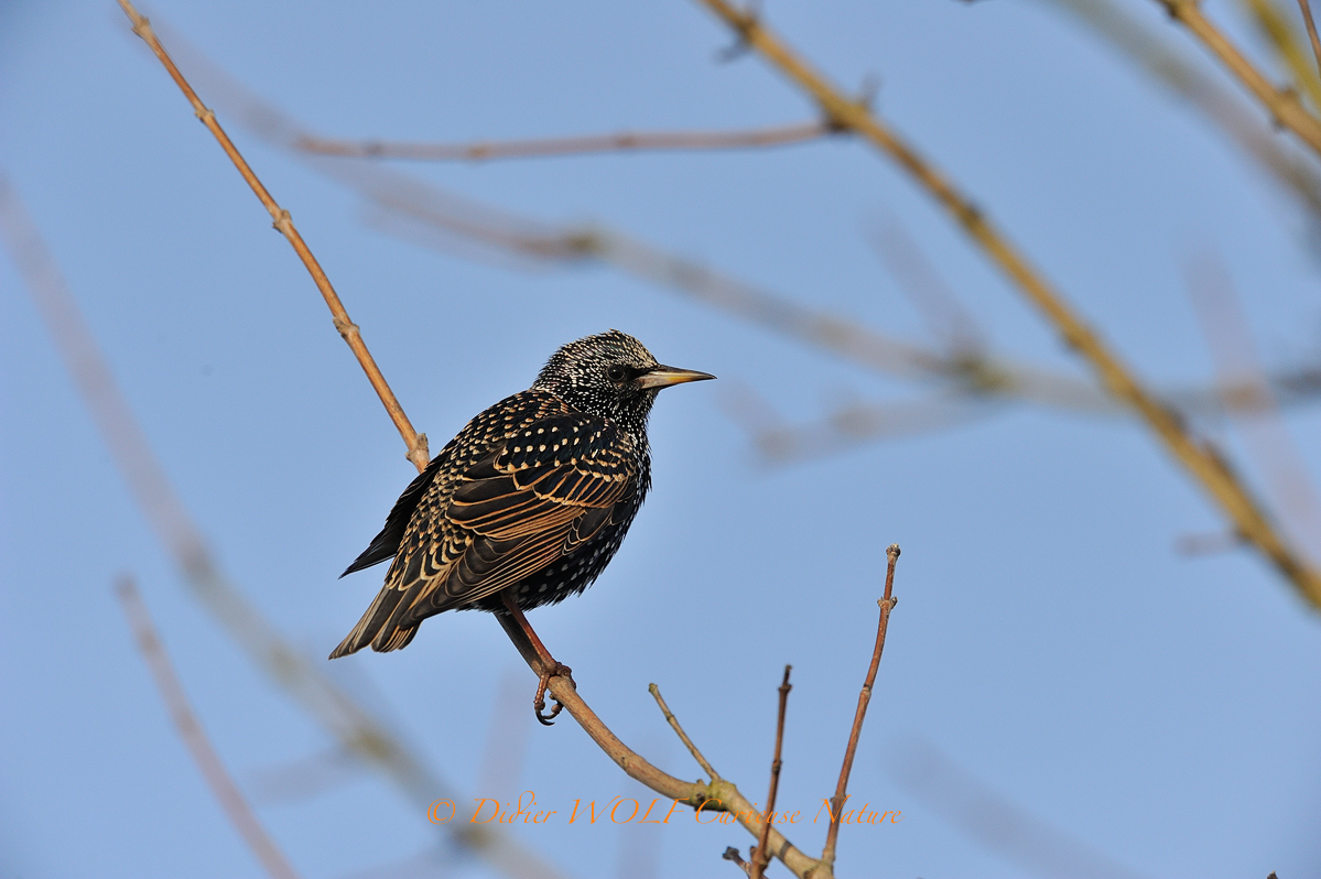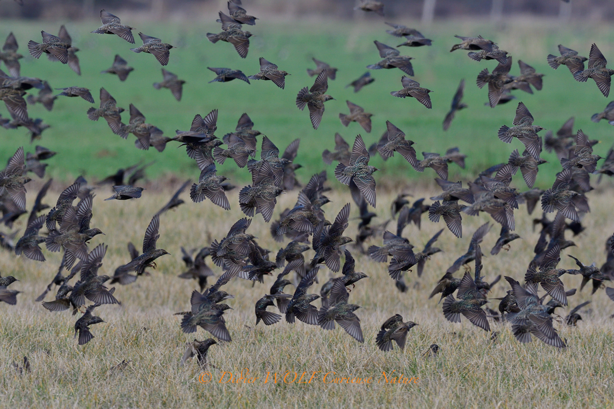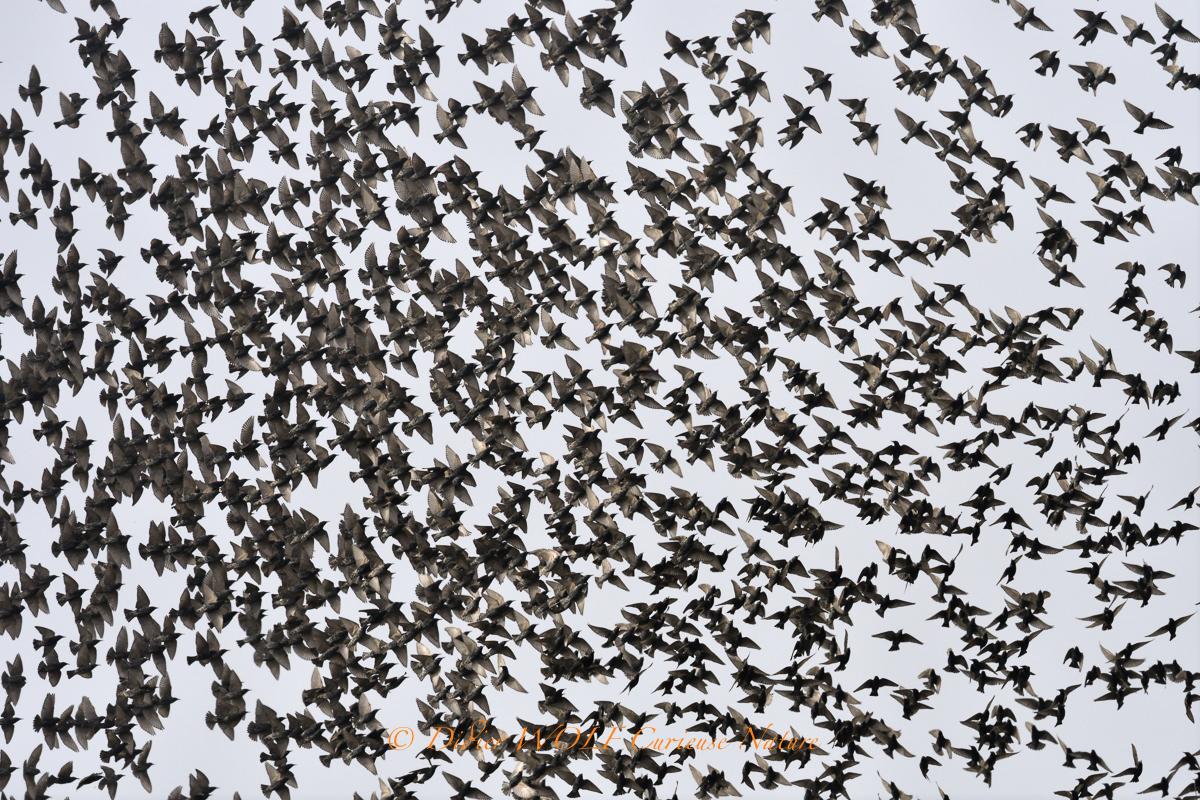L’Étourneau sansonnet peut être confondu avec le Merle noir (Turdus merula) car ils ont tous deux le corps noir avec le bec jaune en plumage nuptial. Cependant, en regardant de plus près, l’Étourneau sansonnet s’en distingue par son plumage aux reflets verts et violets, moucheté de points blancs. Sa queue est courte et son bec est pointu et assez long. Il marche énergiquement. En hiver le bec est foncé. Son vol est rapide et peu onduleux. En vol, la silhouette est typique avec les ailes assez pointues. Le répertoire du sansonnet est riche. Il comprend de nombreuses imitations d’autres oiseaux, des sifflements, des grincements. Originaire des zones tempérées et boréales de l’Eurasie, l’Étourneau sansonnet s’est répandu avec succès sur tous les continents : on parle d’espèce cosmopolite. L’Étourneau sansonnet est un oiseau grégaire qui forme des groupes à longueur d’année. Il adopte un comportement territorial avec ses congénères uniquement en période de nidification. Dès l’émancipation des jeunes, les familles se regroupent, se nourrissent ensemble et passent la nuit ensemble en dortoirs. Source : LPO