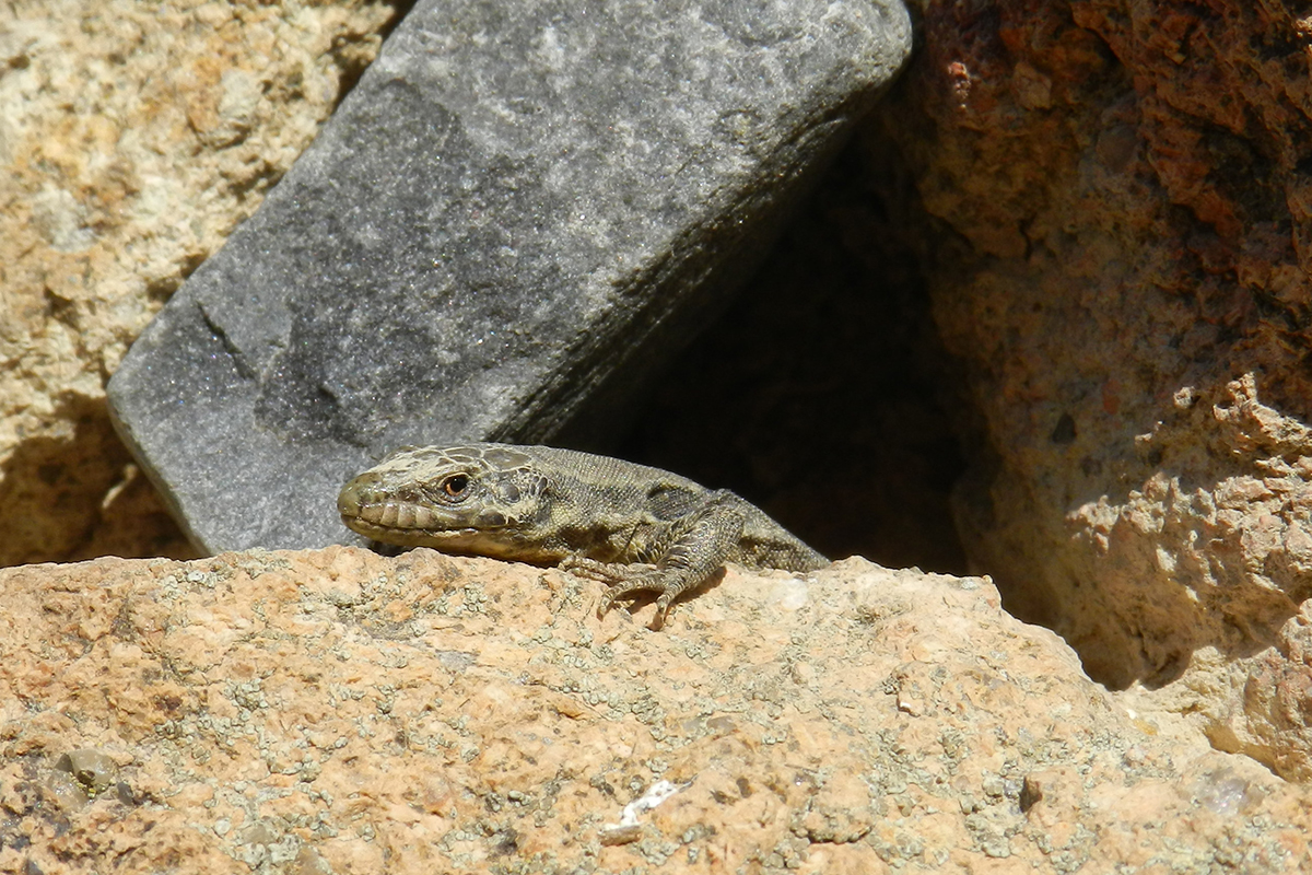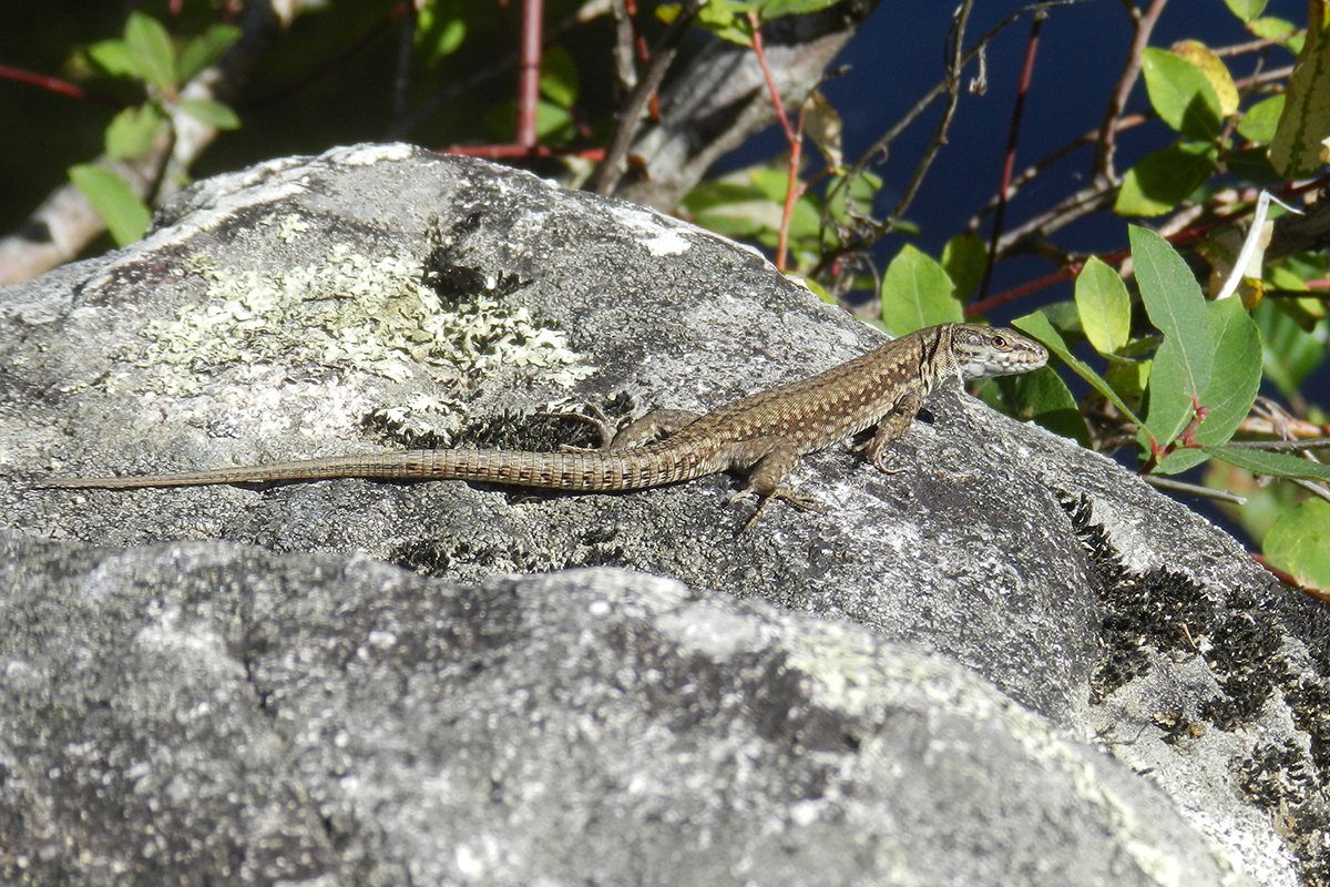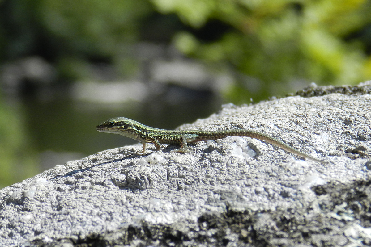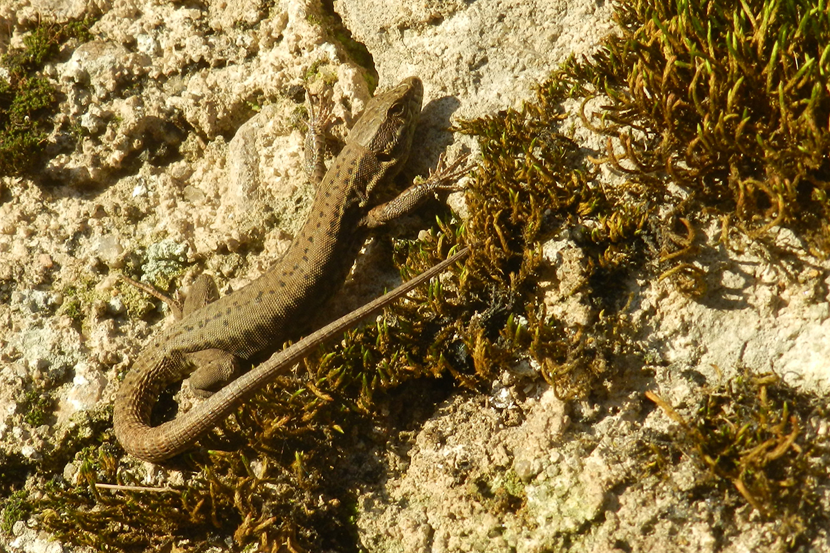Le lézard des murailles, de la famille des Lacertidés, et d’une longueur de 20 cm environ, présente un corps écailleux gris, brun, verdâtre, plus ou moins strié, le dessous étant plus clair. La femelle est généralement un peu plus petite que le mâle. Principalement diurne, il vit 4 à 6 ans en moyenne, (10 ans au maximum) dans les lieux secs et ensoleillés comme les murets, les éboulis, les talus et voies ferrées, les anfractuosités des rochers bien exposés où il se réfugie au moindre danger ; Il est aussi présent dans les jardins abrités, les tas de bois et à proximité des habitations. De novembre à mars, il observe un repos hivernal mais il n’est pas rare de l’apercevoir lors de ses bains de soleil, même en hiver. Source : ONF, amphibiens et reptiles…