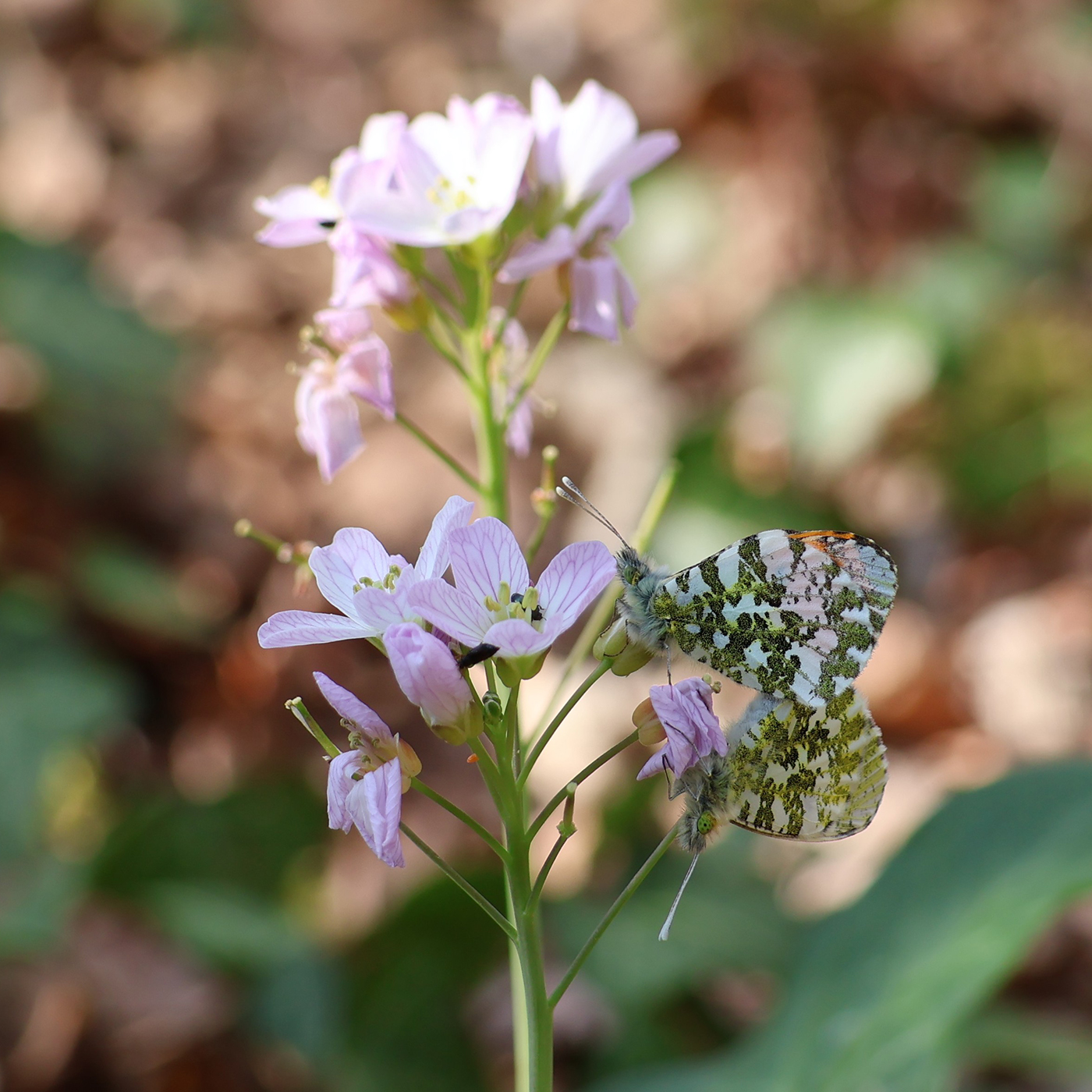 Ce papillon printanier appartient à la famille des Piérides comme le citron, le gazé, les marbrés, etc. Ailes déployées, le mâle est blanc crème et l’orange vif qui orne ses ailes antérieures le distingue de la femelle dont l’apex des ailes est voilé de gris. Le dessous des ailes est, pour le mâle comme pour la femelle, blanc marbré de vert. Cet annonciateur du printemps nous gratifie de sa présence dès février et surtout en mars-avril en plaine ; ailleurs, en zones climatiques défavorables (régions septentrionales ou montagneuses) il s’observe alors en mai-juin, voire en juillet. L’Aurore est univoltin (une seule génération annuelle), il affectionne les prairies où pousse la cardamine des prés (une de ses plantes hôtes), les lisières et même les jardins où poussent des arabettes, des lunaires et autres crucifères telles les giroflées. Les mâles sillonnent inlassablement leurs milieux favorables à la recherche d’une femelle qui dépose, une fois accouplée, ses œufs un à un à la base d’un bouton floral de la plante-hôte. Cette espèce hiverne sous forme de chrysalide et se rencontre dans toute la France. Source : Papillons de jour du Poitou-Charentes. Poitou-Charentes Nature