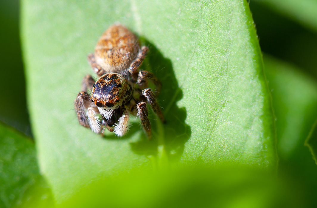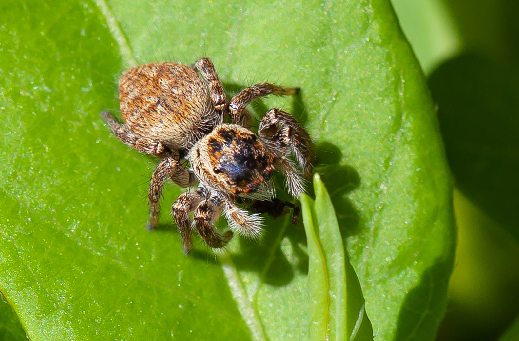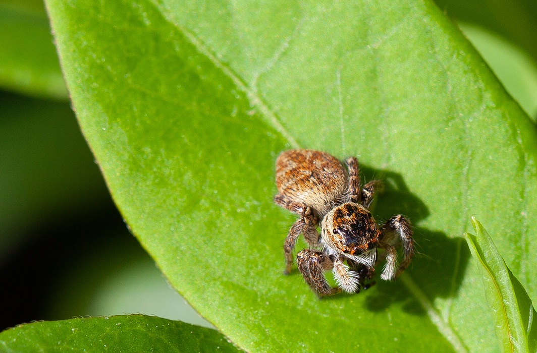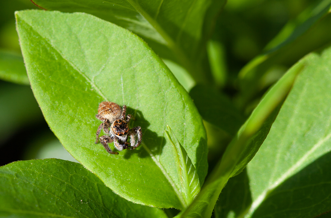 On admire tout de suite la dense pilosité de cette toute petite araignée… Mais si vous décidiez de l’observer plus longuement, c’est surtout une aptitude surprenante au saut qui vous captivera ! Cette caractéristique de la famille des Salticidae à laquelle elle appartient, s’accompagne d’une vision binoculaire. Deux grands yeux, lui offrent une très bonne acuité visuelle pour appréhender les mouvements environnants, ainsi que des couleurs. Des yeux latéraux antérieurs, plus petits et immobiles renforcent ses capacités avec une vision monoculaire sur les côtés. Quatre autres yeux plus petits sont situés vers l’arrière, soit huit yeux pour un champ de vision à 360° ! La saltique orangée chasse donc à vue en s’approchant de ses proies sur lesquelles elle bondit avec talent… nul besoin de s’abîmer au tissage laborieux d’une toile ! Ici une femelle, grande d’environ 5 mm et reconnaissable par ses teintes brun-jaunâtre, savoure son petit-déjeuner, une fourmi peut-être… Le mâle, lui, se démarque avec une teinte majoritairement noire et un abdomen orangé.