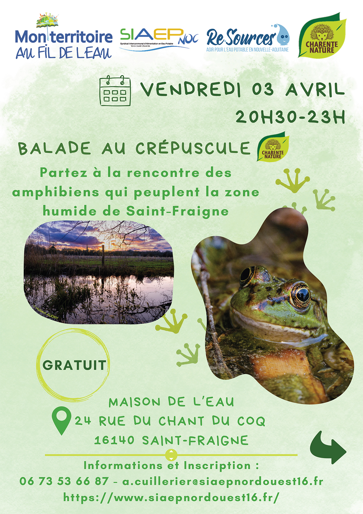 Après une séance de révision sur l’identification des amphibiens, diaporama à l’appui, vous serez accompagné par Charente Nature, pour une balade nocturne de 2h30. Partez à la rencontre de ces animaux fascinants qui peuplent la zone humide de Saint-Fraigne ! Située sur le bassin versant de l’Aume, la zone humide de Saint-Fraigne est un milieu naturel chargé d’histoire… De nombreuses personnes se sont mobilisées pour la réhabilitation de cet habitat propice au développement d’une riche biodiversité… L’histoire de la zone humide de Saint-Fraigne…