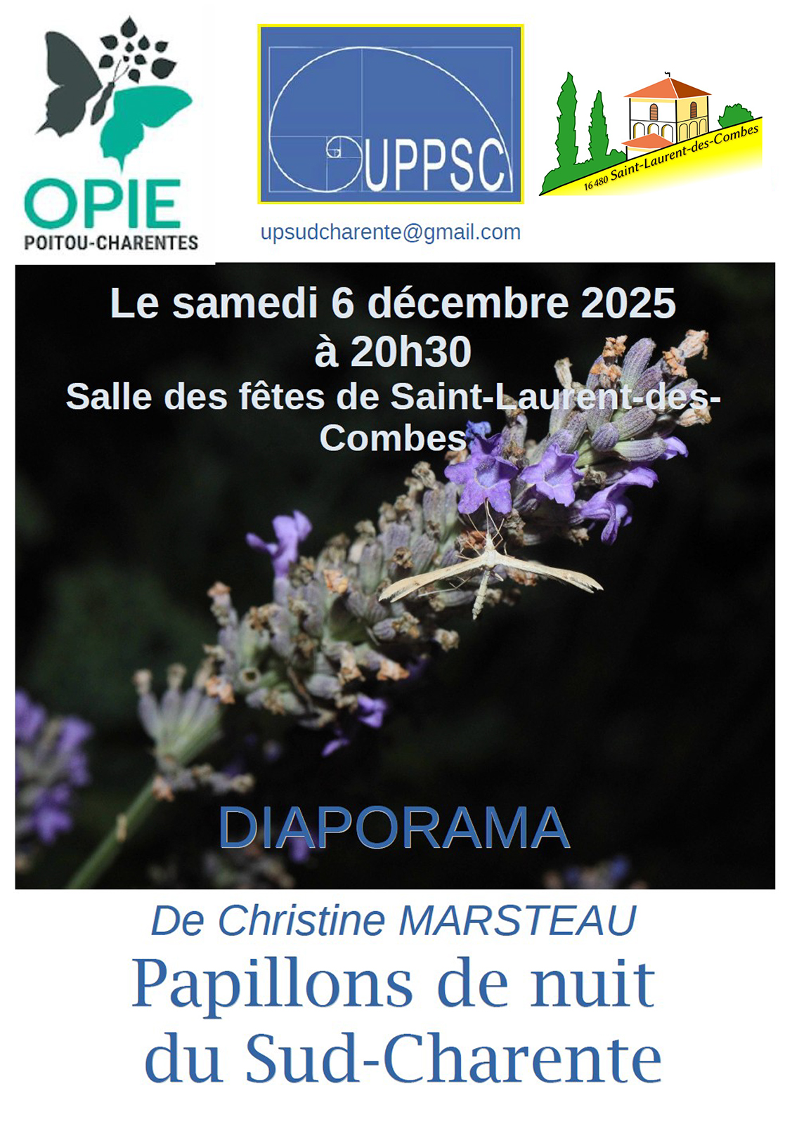 Cette soirée est organisée en partenariat avec l’OPIE Poitou-Charentes, qui a pour mission de sensibiliser le public au monde des insectes et de favoriser la connaissance des invertébrés dans leurs milieux naturels, avec l’Université Populaire du Pays Sud-Charente (UPPSC) et le concours du comité des fêtes de la commune de Saint-Laurens des Combes.