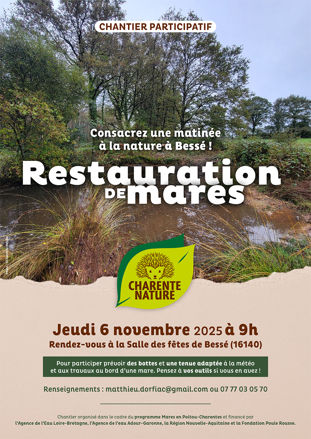Cette restauration s’inscrit dans le cadre du programme Mares en Poitou-Charentes, avec des interventions sur le terrain pour créer et/ou restaurer des mares du département de la Charente. Lancé depuis 2020, ce programme est financé par l’Agence de l’Eau Loire-Bretagne, l’Agence de l’eau Adour-Garonne, la Région Nouvelle-Aquitaine et la Fondation Poule Rousse.
